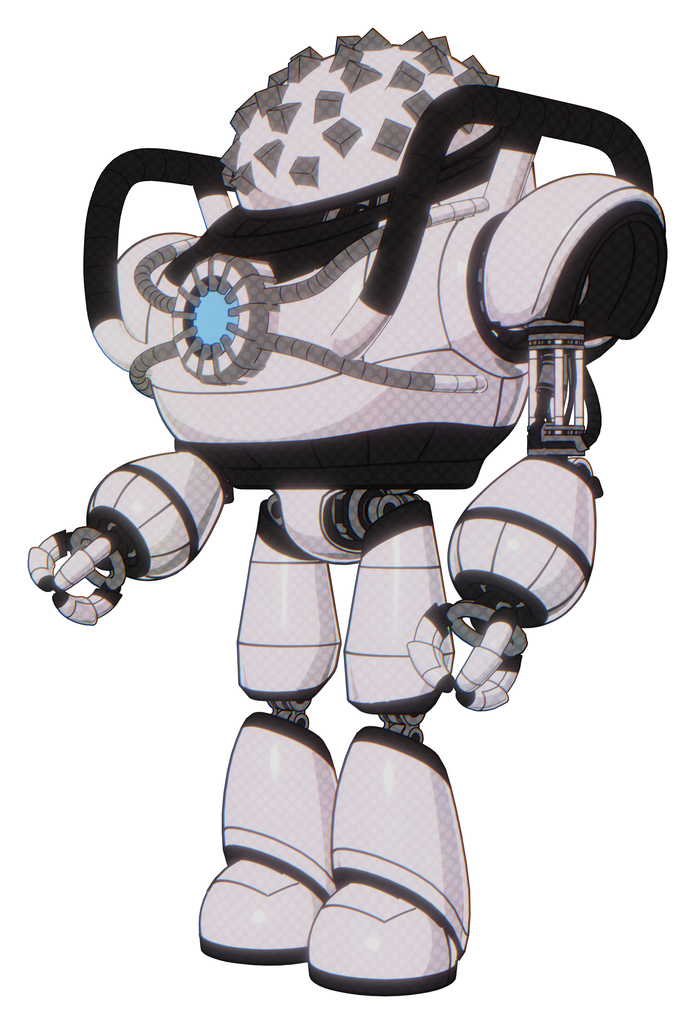 Robot containing metal cubes dome head design and heavy upper chest and chest blue energy core and light leg exoshielding. White halftone toon. Facing right view.