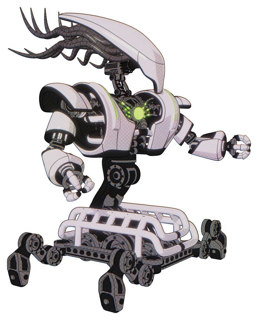 Cyborg containing flat elongated skull head and cables and heavy upper chest and heavy mech chest and green energy core and insect walker legs. White halftone toon. Interacting.