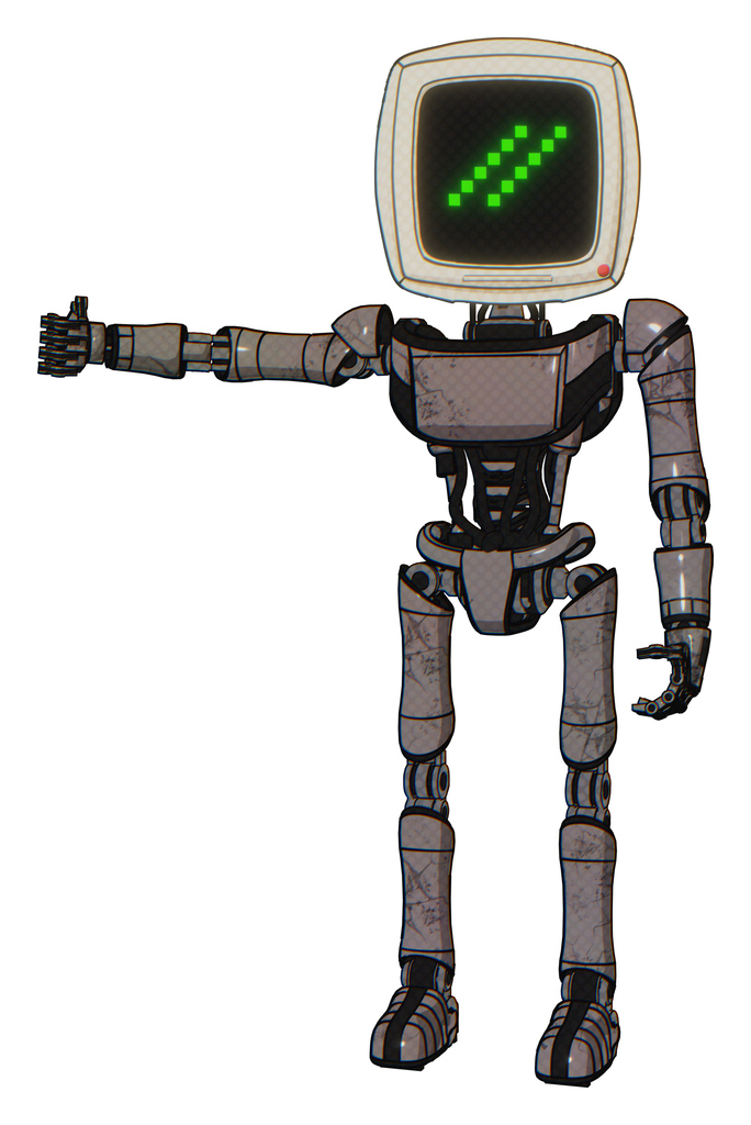 Robot containing old computer monitor and double backslash pixel design and light chest exoshielding and ultralight chest exosuit and ultralight foot exosuit. Light pink beige.