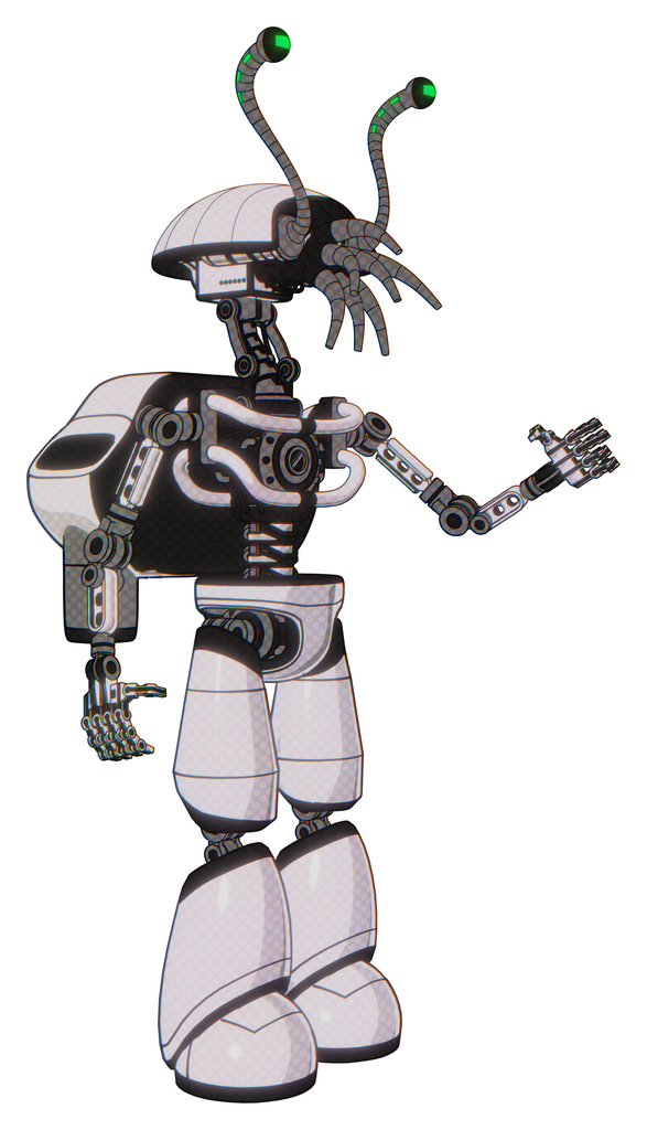 Cyborg containing dual retro camera head and shrimp head and light chest exoshielding and rocket pack and no chest plating and light leg exoshielding. White halftone toon. Interacting.