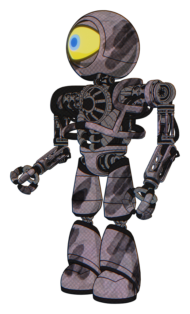 Mech containing giant eyeball head design and heavy upper chest and no chest plating and light leg exoshielding. Sketch pad wet ink smudge. Facing right view.