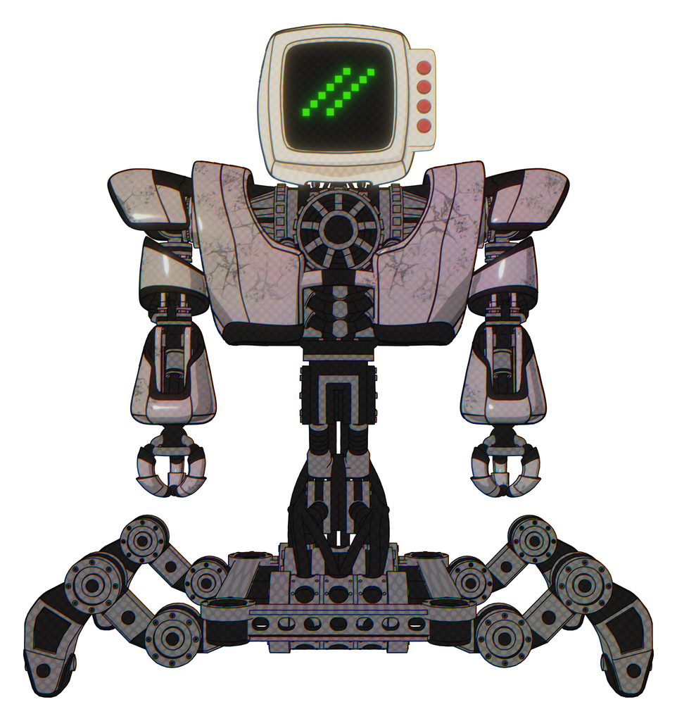Robot containing old computer monitor and double backslash pixel design and red buttons and heavy upper chest and heavy mech chest and insect walker legs. Gray metal. Front view.