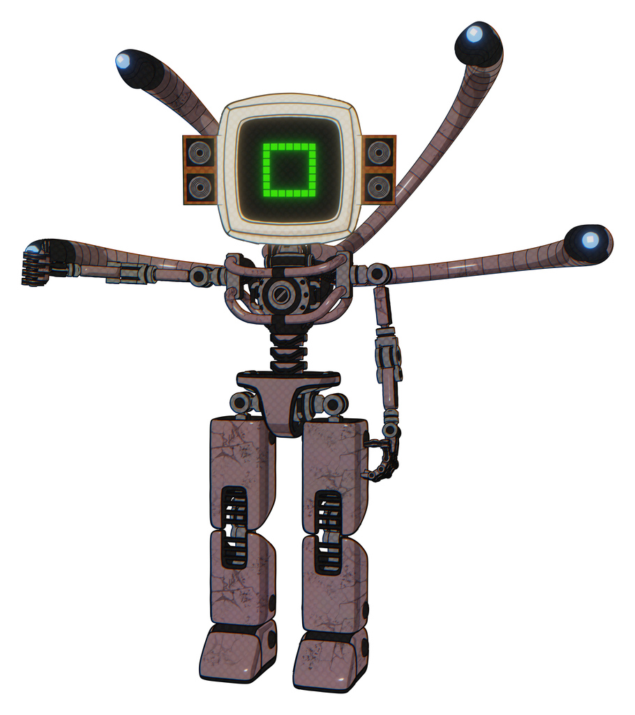 Droid containing elements: old computer monitor, pixel square design, old retro speakers, light chest exoshielding, blue-eye cam cable tentacles, no chest plating, prototype exoplate legs.