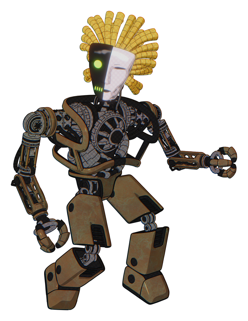 Mech containing humanoid face mask and two-face black white mask and heavy upper chest and no chest plating and prototype exoplate legs. Old copper. Fight or defense pose..