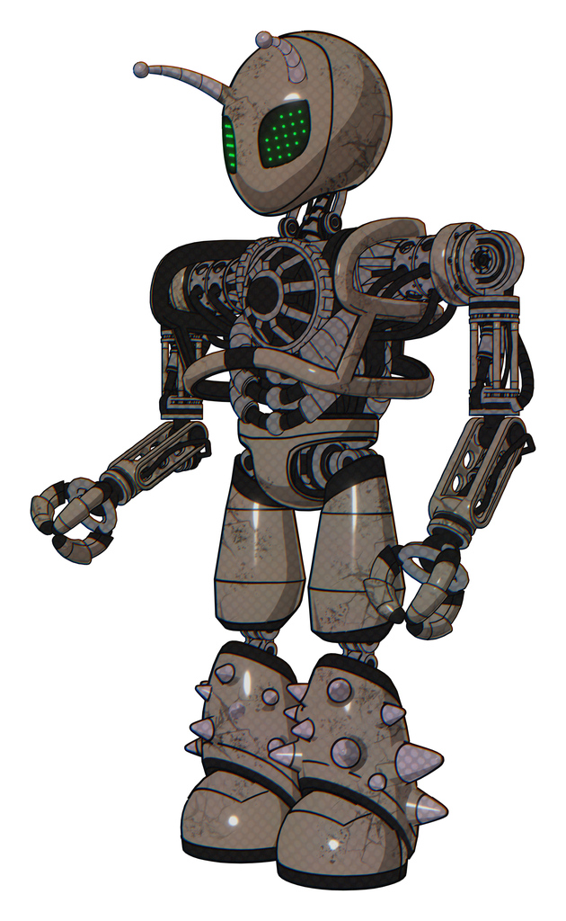 Mech containing grey alien style head and led array eyes and bug antennas and heavy upper chest and no chest plating and light leg exoshielding and spike foot mod. Patent khaki metal.