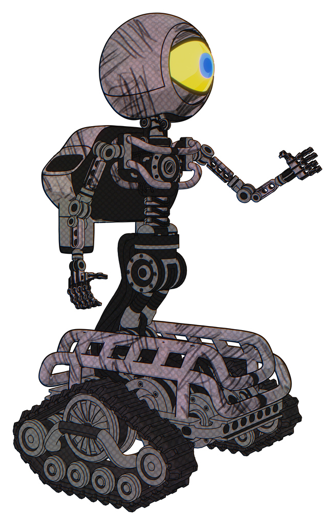 Robot containing giant eyeball head design and light chest exoshielding and rocket pack and no chest plating and tank tracks. Dark sketchy. Interacting.