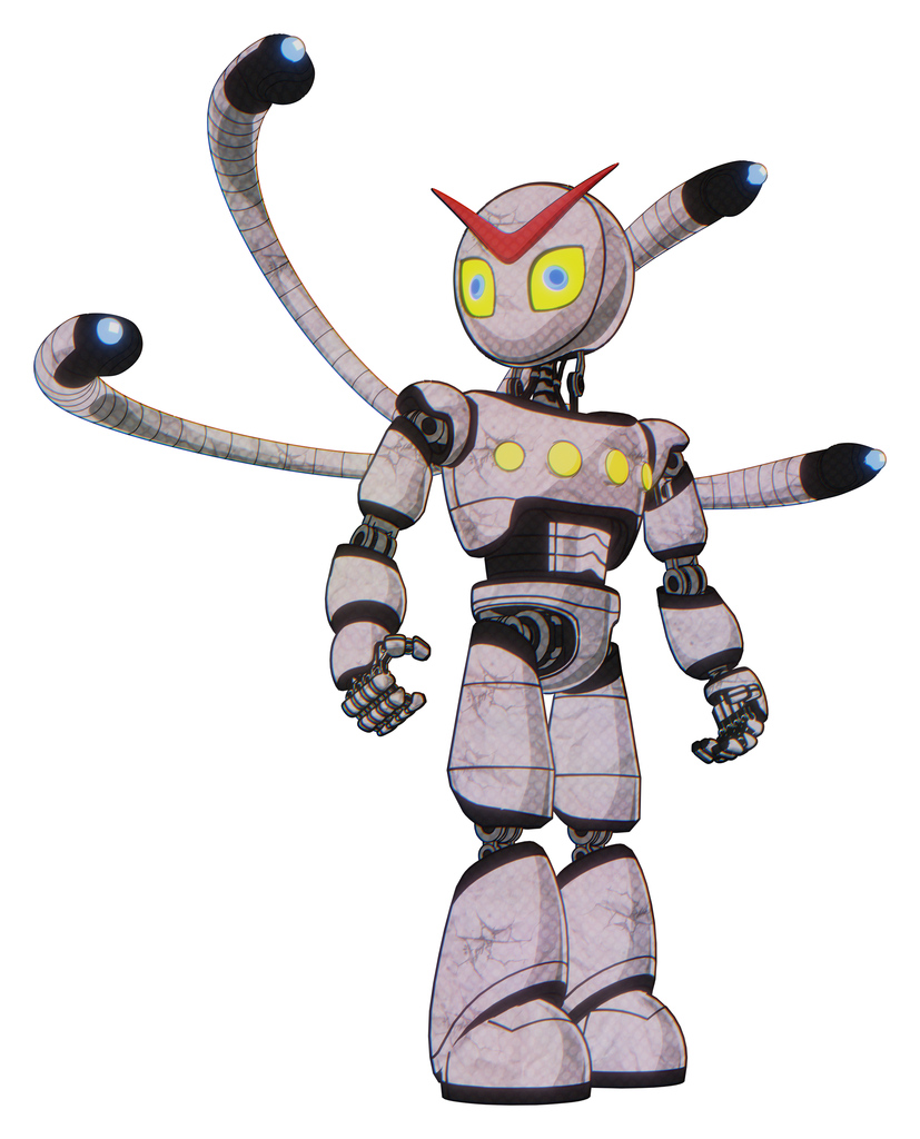 Cyborg containing grey alien style head and yellow eyes with blue pupils and light chest exoshielding and yellow chest lights and blue-eye cam cable tentacles and light leg exoshielding.