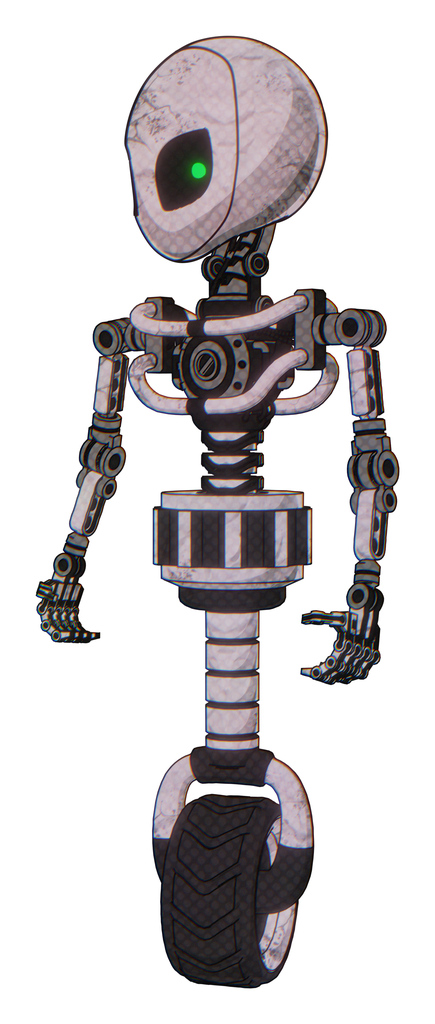 Cyborg containing grey alien style head and green inset eyes and light chest exoshielding and no chest plating and unicycle wheel. Sketch pad. Standing looking right restful pose.