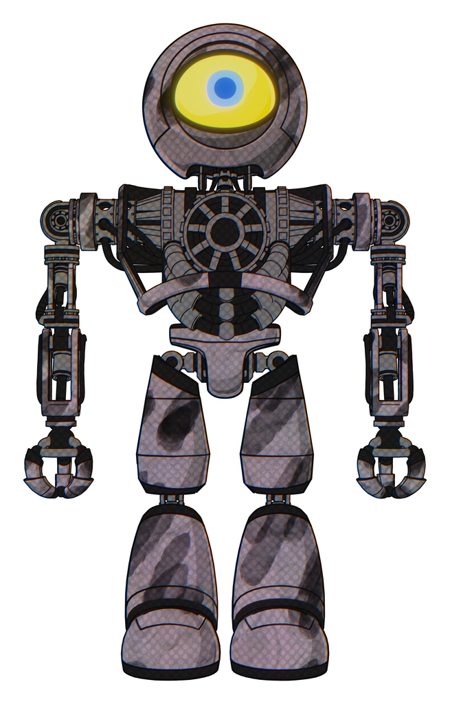 Mech containing giant eyeball head design and heavy upper chest and no chest plating and light leg exoshielding. Sketch pad wet ink smudge. Front view.