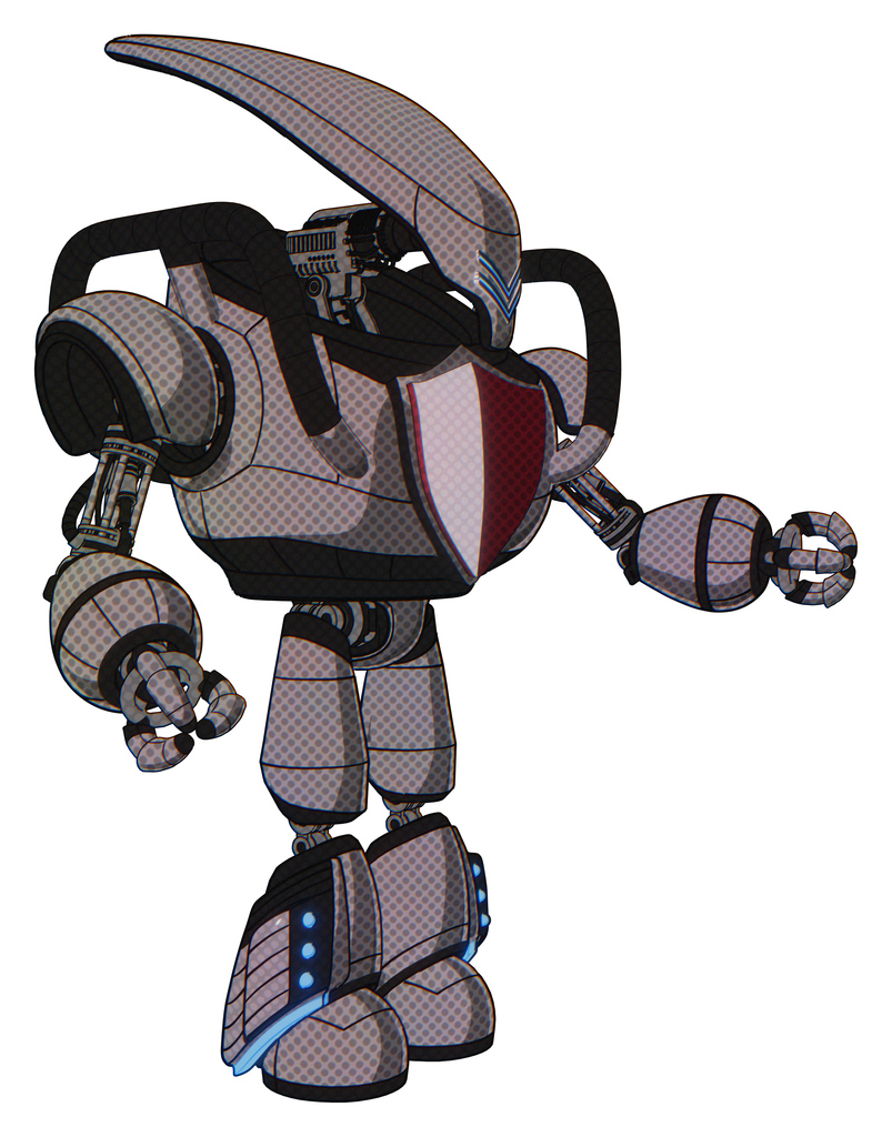 Mech containing flat elongated skull head and heavy upper chest and red shield defense design and light leg exoshielding and megneto-hovers foot mod. Halftone gray. Interacting.