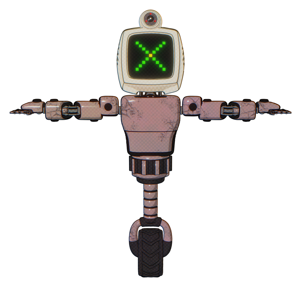 Mech containing old computer monitor and pixel x and retro-futuristic webcam and light chest exoshielding and prototype exoplate chest and unicycle wheel. Powder pink metal. T-pose.