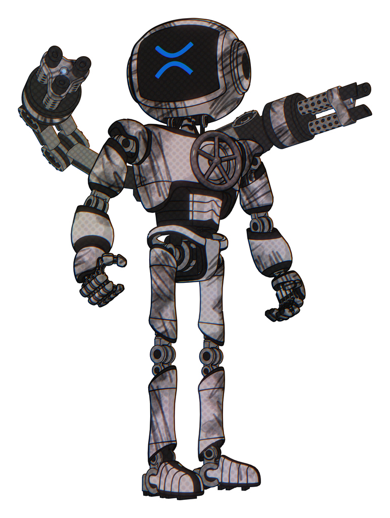 Robot containing digital display head and wince symbol expression and light chest exoshielding and chest valve crank and minigun back assembly and ultralight foot exosuit. Scribble sketch. Hero pose.