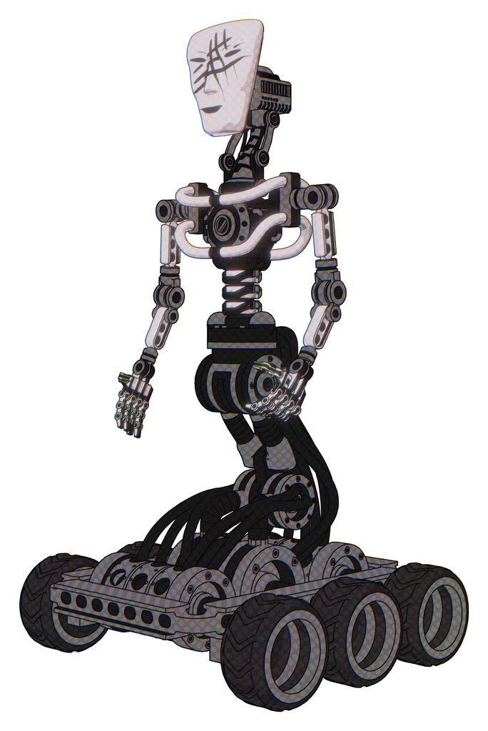 Robot containing humanoid face mask and slashes war paint and light chest exoshielding and no chest plating and six-wheeler base. White halftone toon. Facing right view.