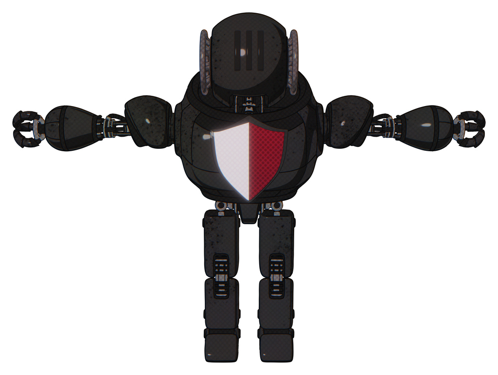 Bot containing round head and three lens sentinel visor and heavy upper chest and red shield defense design and prototype exoplate legs. Dirty black. T-pose.