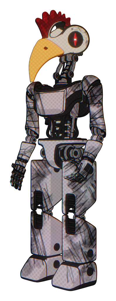 Cyborg containing bird skull head and red line eyes and chicken design and light chest exoshielding and ultralight chest exosuit and prototype exoplate legs. Scribble sketch. Facing right view.