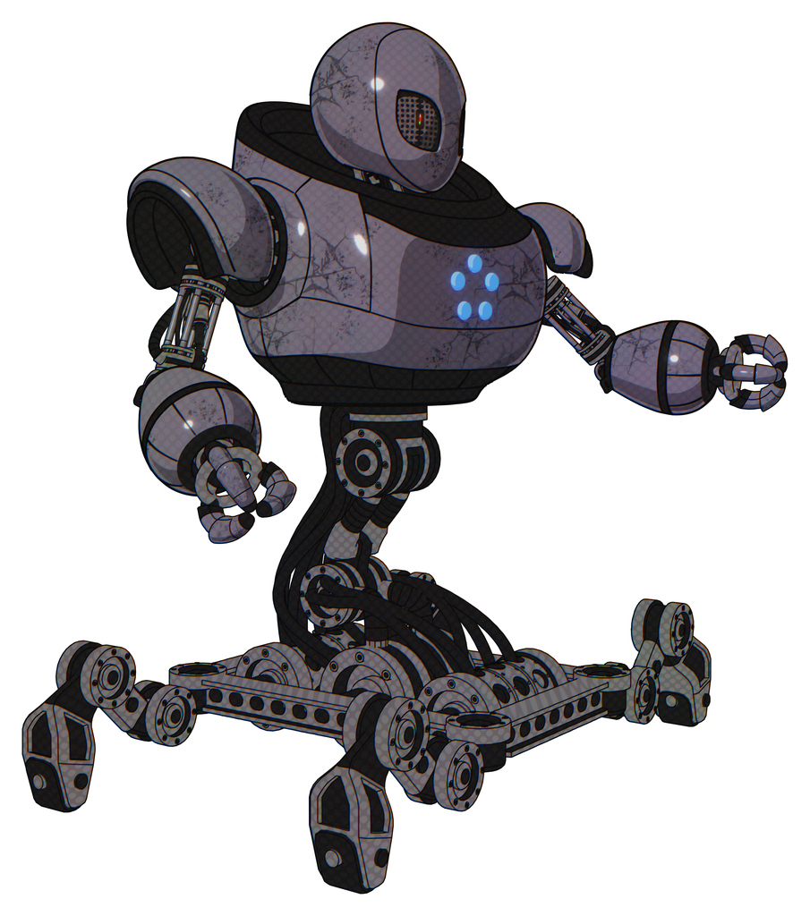 Cyborg containing grey alien style head and metal grate eyes and heavy upper chest and circle of blue leds and insect walker legs. Light lavender metal. Interacting.