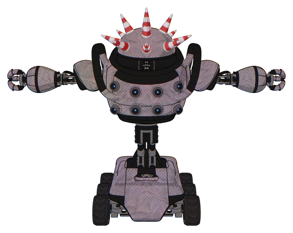Mech containing red and white cone dome head and heavy upper chest and chest energy sockets and six-wheeler base. Dark sketch. T-pose.
