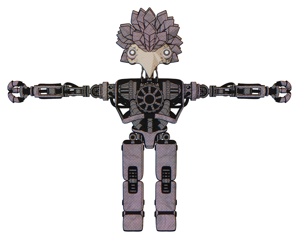 Automaton containing bird skull head and white eyeballs and bird feather design and heavy upper chest and no chest plating and prototype exoplate legs. Dark sketch. T-pose.