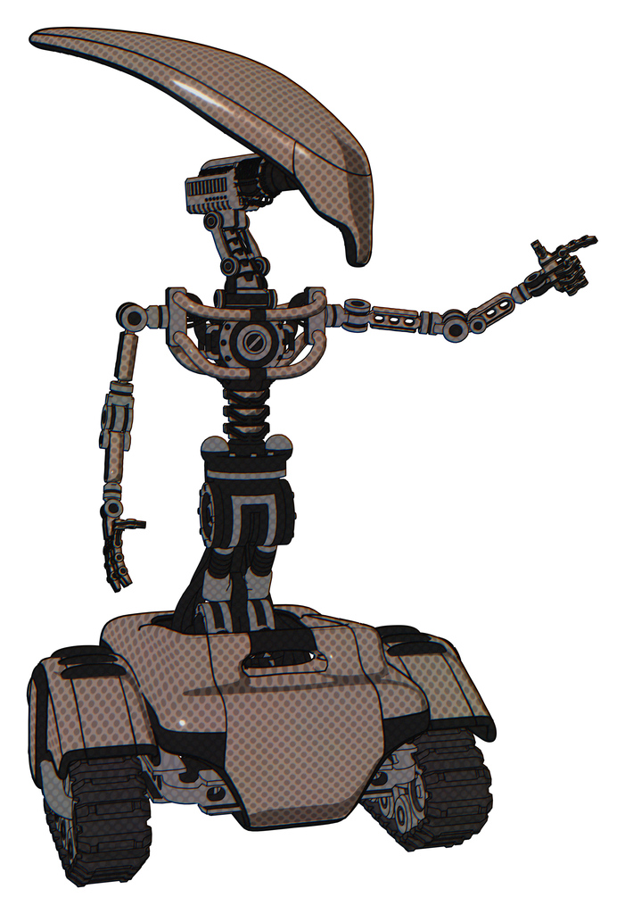 Automaton containing flat elongated skull head and light chest exoshielding and no chest plating and tank tracks. Khaki halftone. Pointing left or pushing a button..