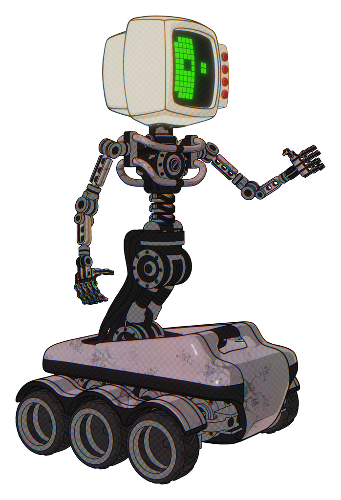 Bot containing old computer monitor and abstract mask pixel face and red buttons and light chest exoshielding and no chest plating and six-wheeler base. Gray metal. Interacting.