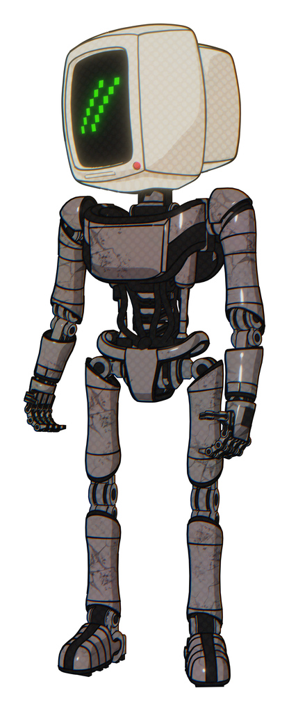 Robot containing old computer monitor and double backslash pixel design and light chest exoshielding and ultralight chest exosuit and ultralight foot exosuit. Light pink beige.