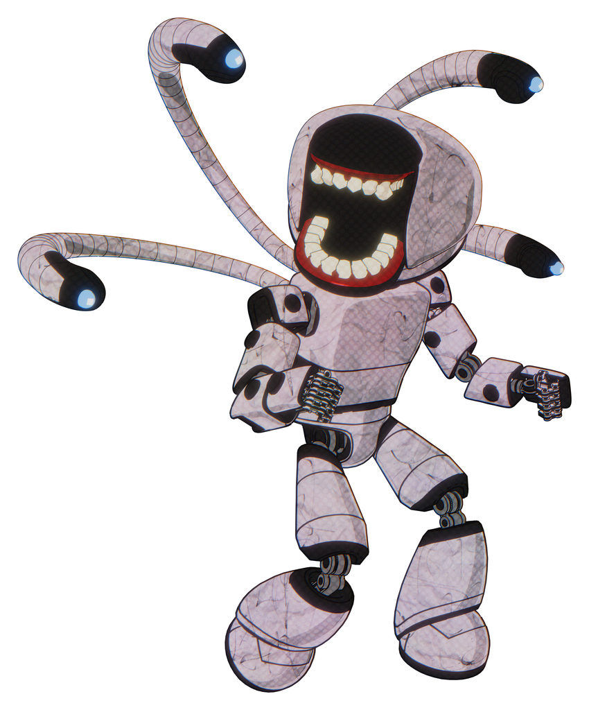 Droid containing chomper head design and light chest exoshielding and prototype exoplate chest and blue-eye cam cable tentacles and light leg exoshielding. Sketch pad light lines.