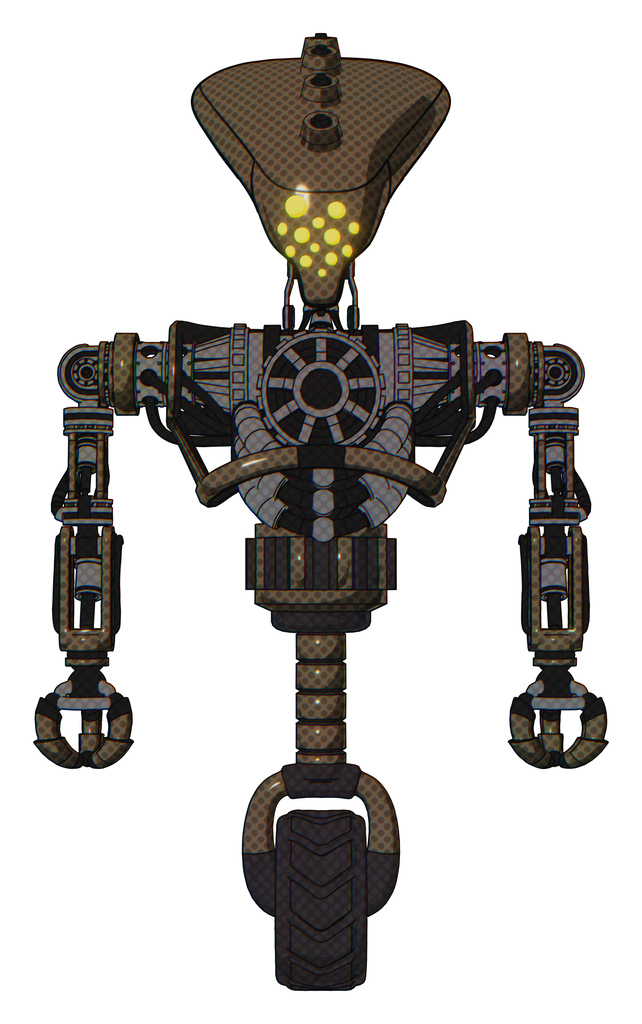 Cyborg containing flat elongated skull head and heavy upper chest and no chest plating and unicycle wheel. Light brown halftone. Front view.