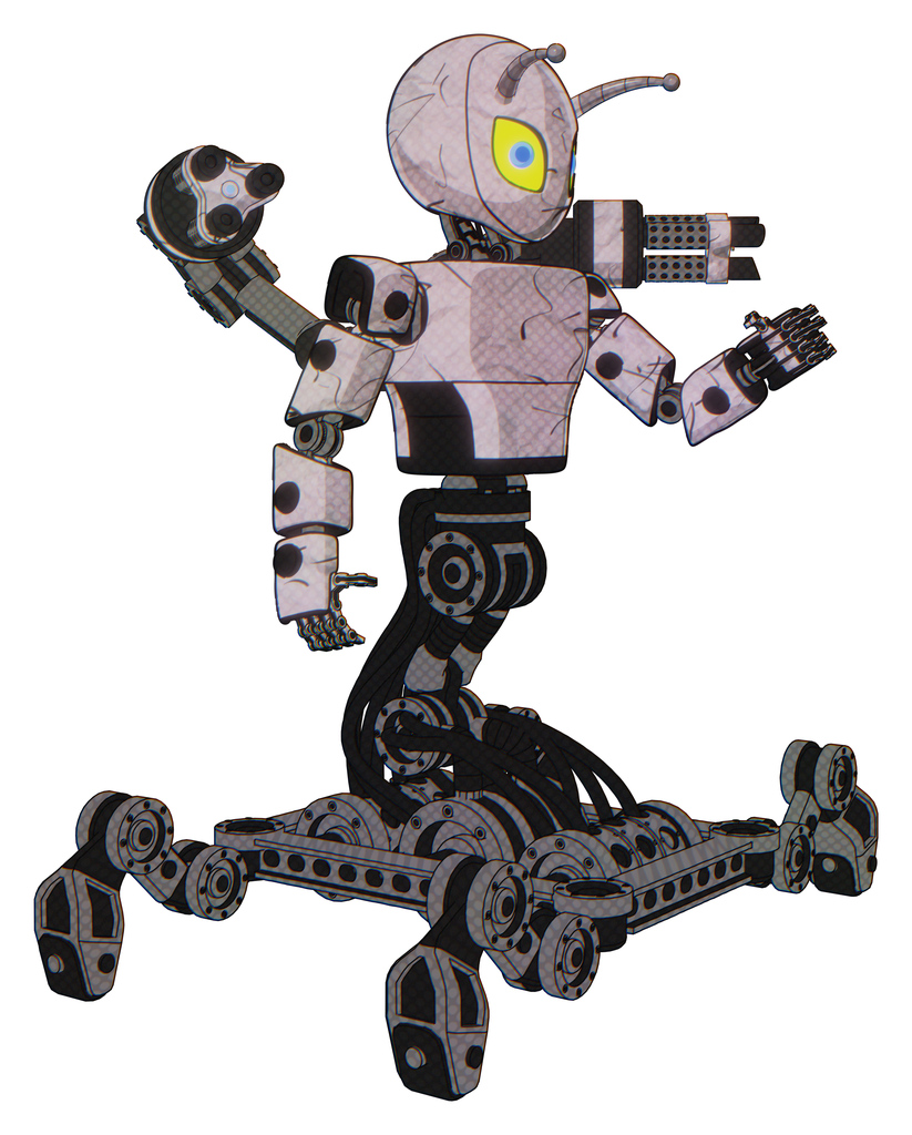 Robot containing elements: grey alien style head, yellow eyes with blue pupils, bug antennas, light chest exoshielding, prototype exoplate chest, minigun back assembly, insect walker legs.