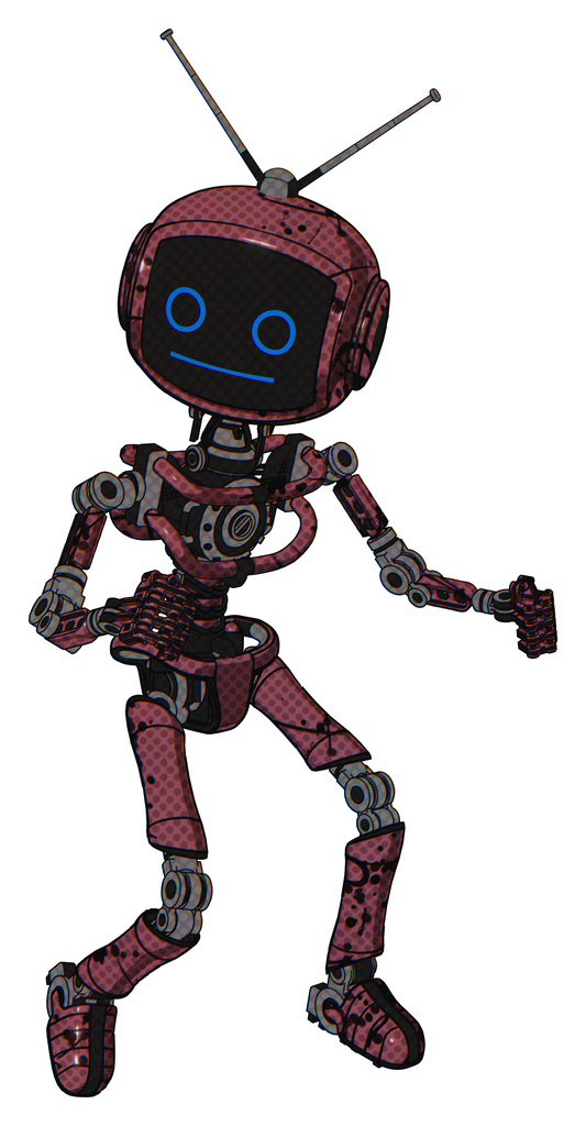 Mech containing digital display head and blank-faced expression and retro antennas and light chest exoshielding and no chest plating and ultralight foot exosuit. Muavewood halftone grunge.
