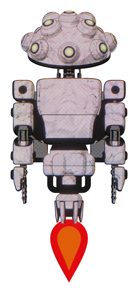Automaton containing techno multi-eyed domehead design and light chest exoshielding and prototype exoplate chest and rocket pack and jet propulsion. Sketch pad light lines. Front view.