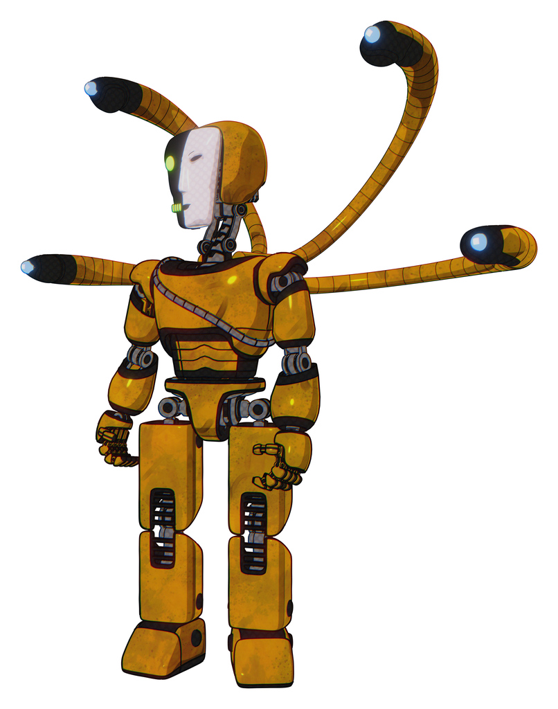 Mech containing humanoid face mask and two-face black white mask and light chest exoshielding and cable sash and blue-eye cam cable tentacles and prototype exoplate legs. Worn construction yellow.