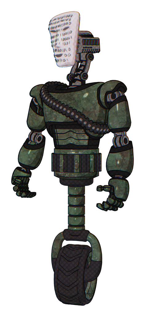 Cyborg containing humanoid face mask and binary war paint and light chest exoshielding and rubber chain sash and unicycle wheel. Old corroded copper. Standing looking right restful pose.
