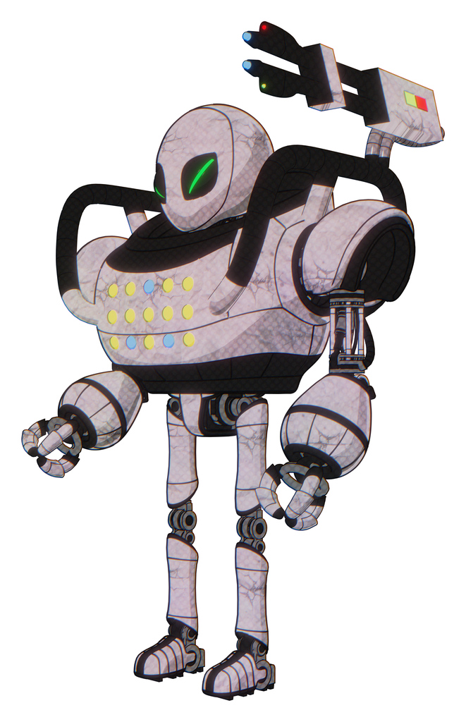 Droid containing grey alien style head and green demon eyes and heavy upper chest and colored lights array and ultralight foot exosuit. Sketch pad light. Facing right view.