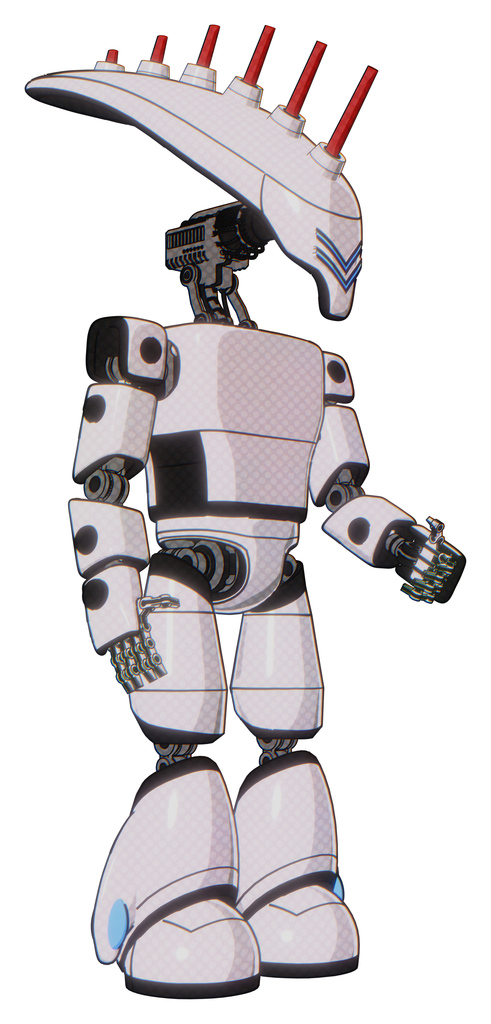 Cyborg containing flat elongated skull head and light chest exoshielding and prototype exoplate chest and light leg exoshielding. White halftone toon. Facing left view.