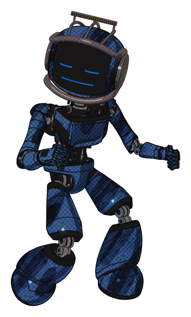Mech containing digital display head and sleeping face and led and protection bars and light chest exoshielding and ultralight chest exosuit and light leg exoshielding. Grunge dark blue.