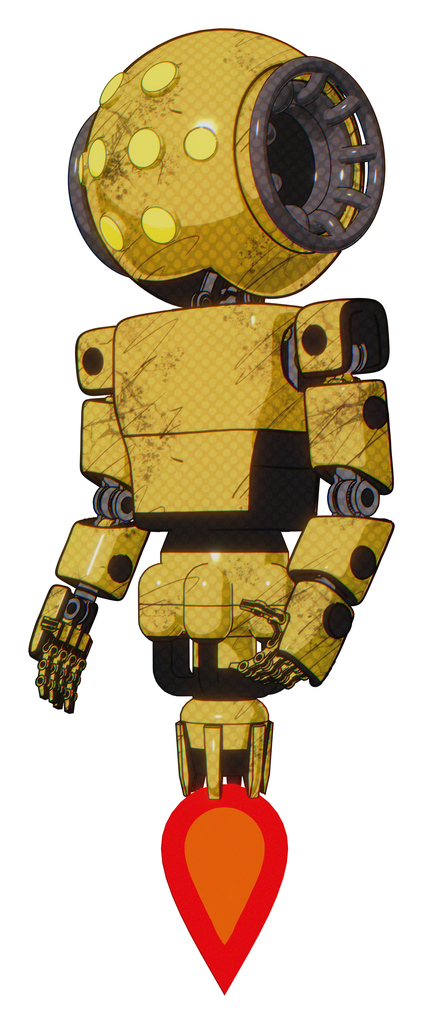 Bot containing round head and yellow eyes array and light chest exoshielding and prototype exoplate chest and jet propulsion. Construction yellow halftone. Facing right view.