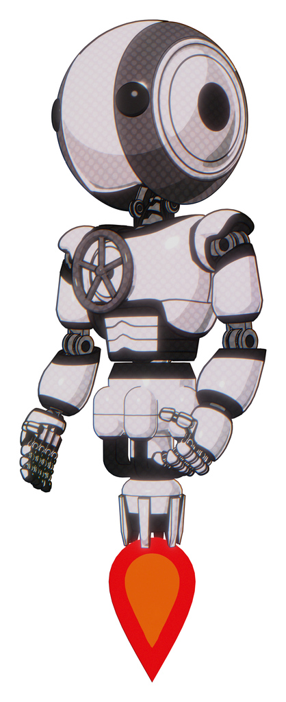 Droid containing round head and maru eyes and light chest exoshielding and chest valve crank and jet propulsion. White halftone toon. Facing right view.
