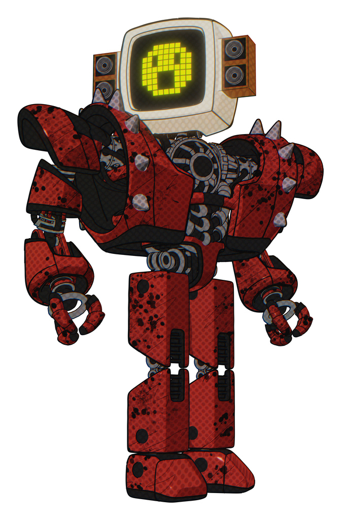 Bot containing old computer monitor and yellow pixel face surprised and old retro speakers and heavy upper chest and heavy mech chest and shoulder spikes and prototype exoplate legs.