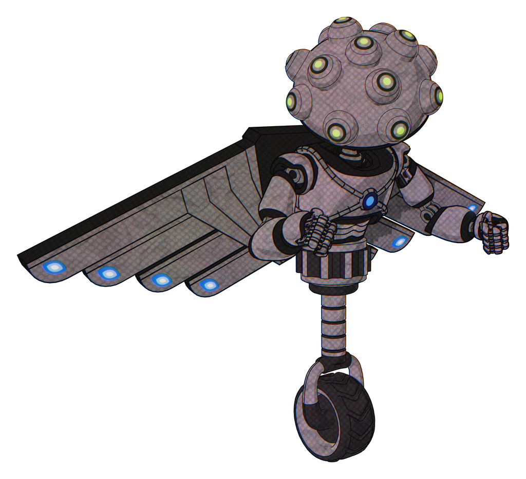 Bot containing techno multi-eyed domehead design and light chest exoshielding and blue energy core and cherub wings design and unicycle wheel. Dark sketch. Fight or defense pose..