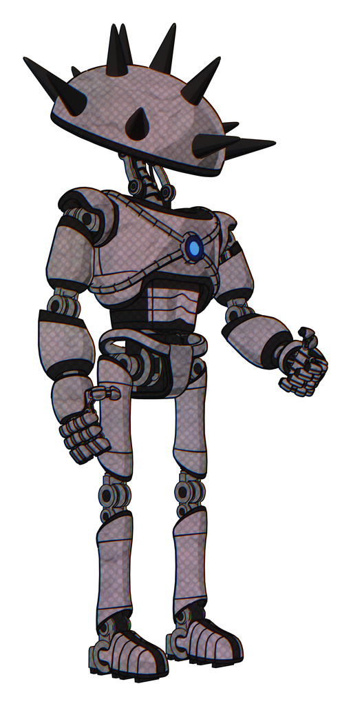 Automaton containing thorny domehead design and light chest exoshielding and blue energy core and ultralight foot exosuit. Dark sketch. Facing left view.