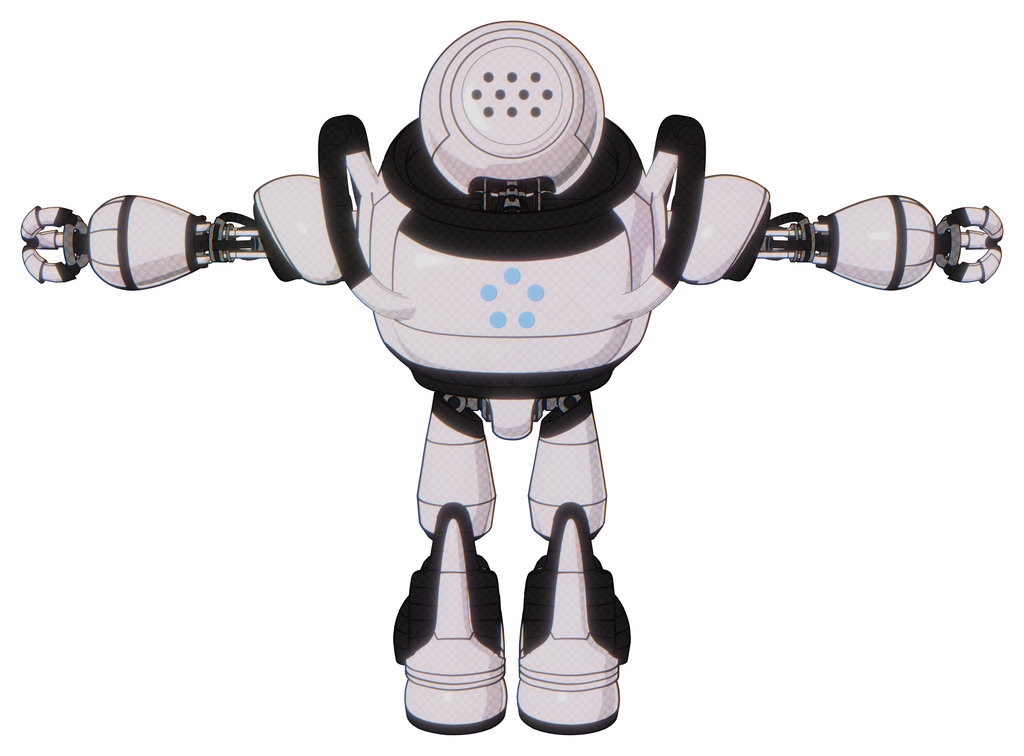 Bot containing dots array face and heavy upper chest and circle of blue leds and light leg exoshielding and stomper foot mod. White halftone toon. T-pose.