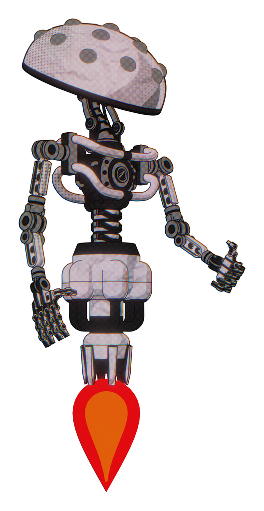 Droid containing metal knucklehead design and light chest exoshielding and no chest plating and jet propulsion. Sketch pad dots pattern. Facing left view.