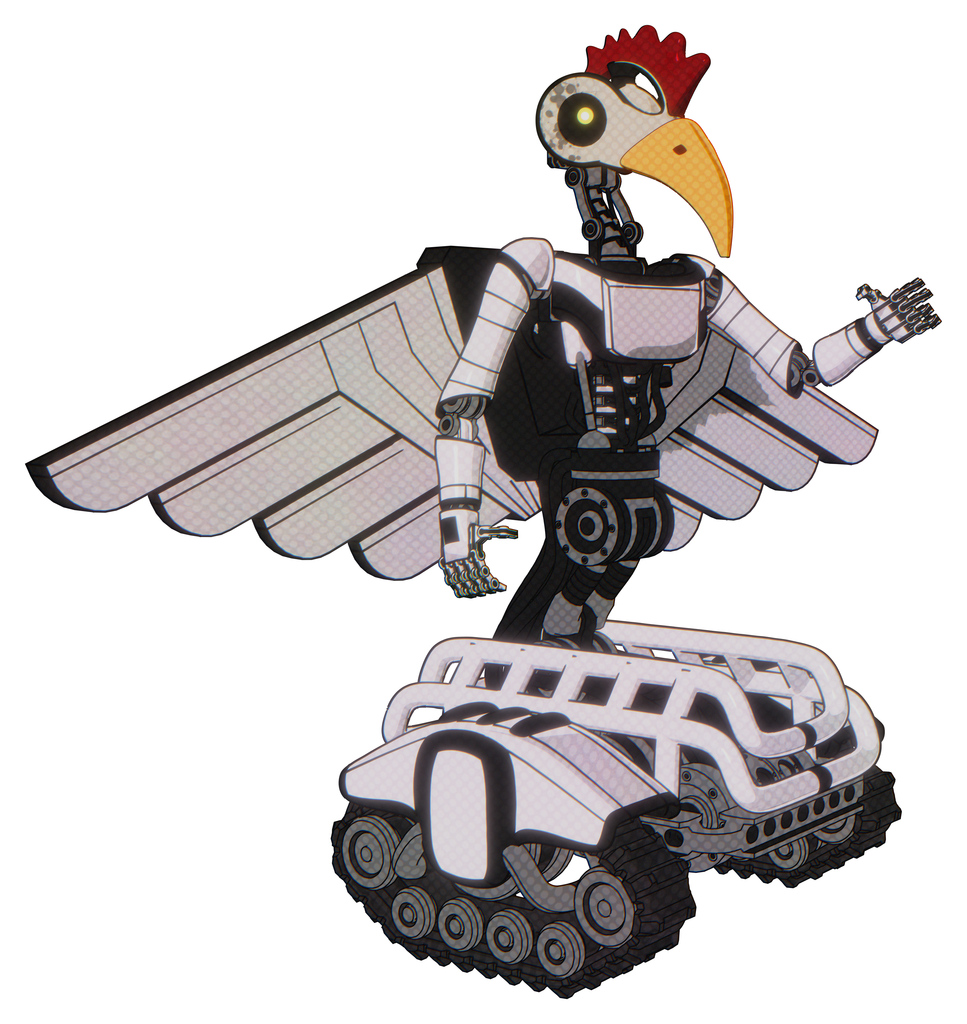 Automaton containing bird skull head and yellow led protruding eyes and chicken design and light chest exoshielding and ultralight chest exosuit and pilot's wings assembly and tank tracks.