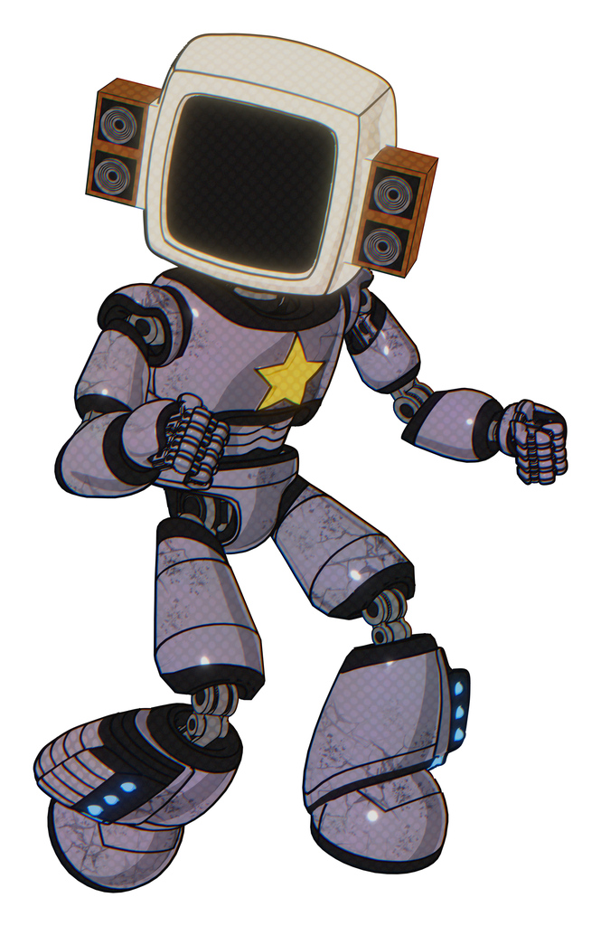 Automaton containing old computer monitor and old retro speakers and light chest exoshielding and yellow star and light leg exoshielding and megneto-hovers foot mod. Matted pink metal.