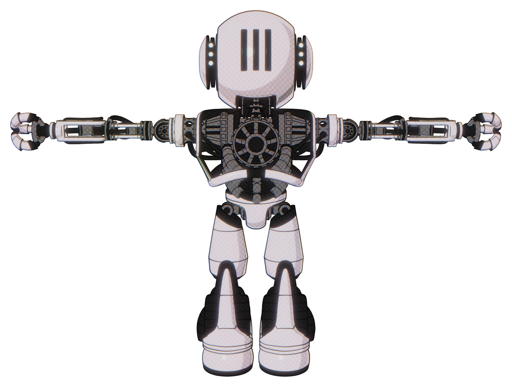Bot containing round head and three lens sentinel visor and head light gadgets and heavy upper chest and no chest plating and light leg exoshielding and stomper foot mod. White halftone toon. T-pose.