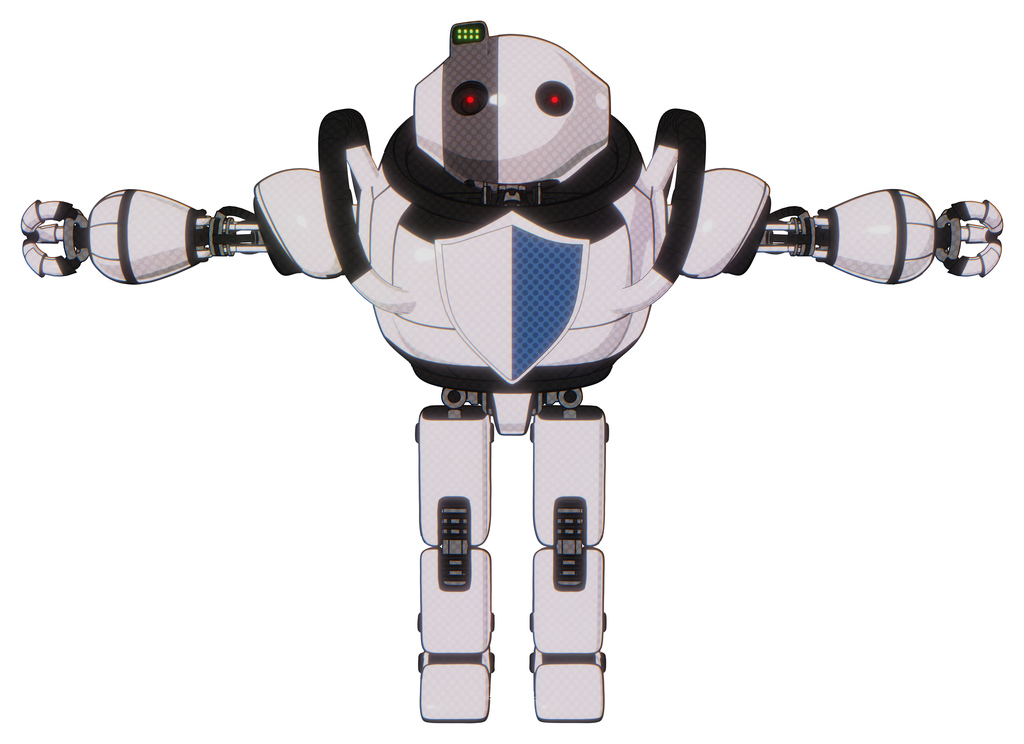 Mech containing oval wide head and small red led eyes and green led ornament and heavy upper chest and blue shield defense design and prototype exoplate legs. White halftone toon. T-pose.