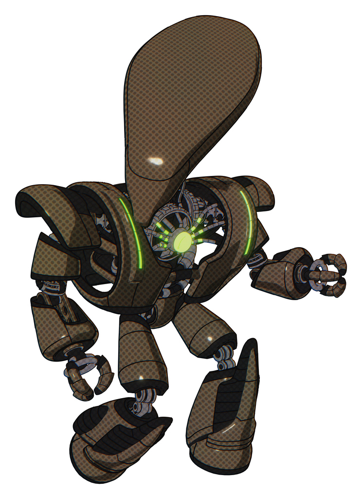 Mech containing flat elongated skull head and heavy upper chest and heavy mech chest and green energy core and light leg exoshielding and stomper foot mod. Light brown halftone.