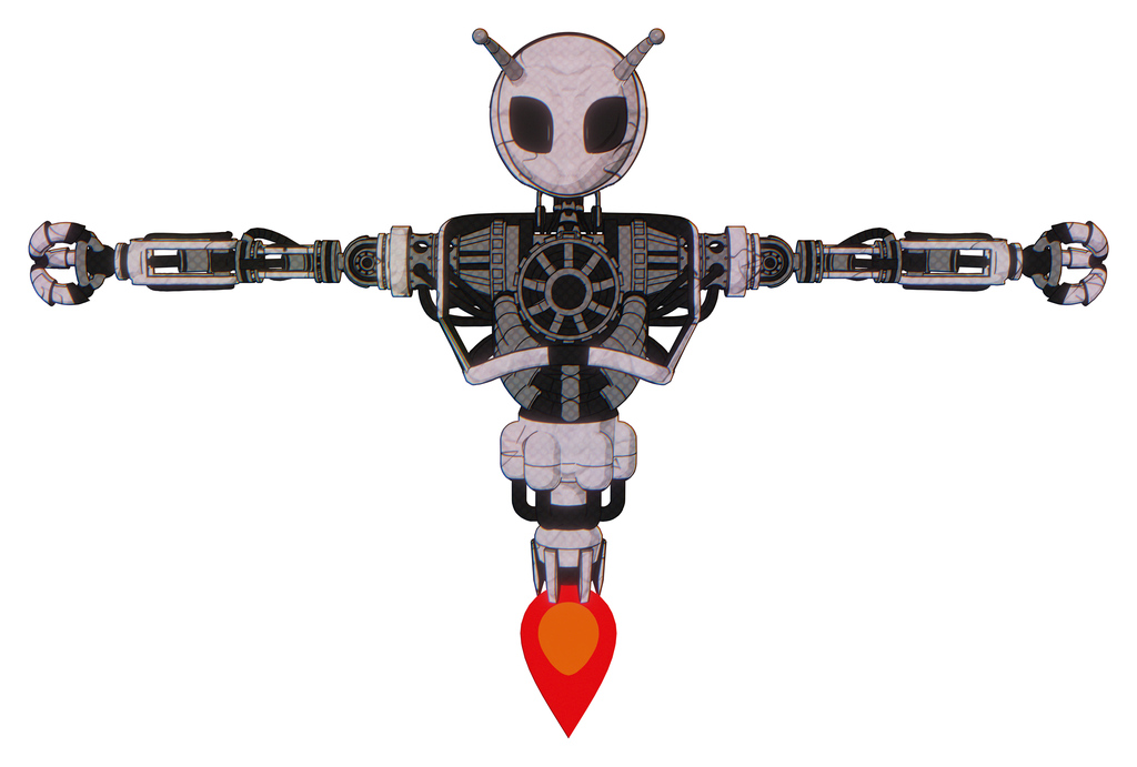 Droid containing grey alien style head and black eyes and bug antennas and heavy upper chest and no chest plating and jet propulsion. Sketch pad doodle lines. T-pose.