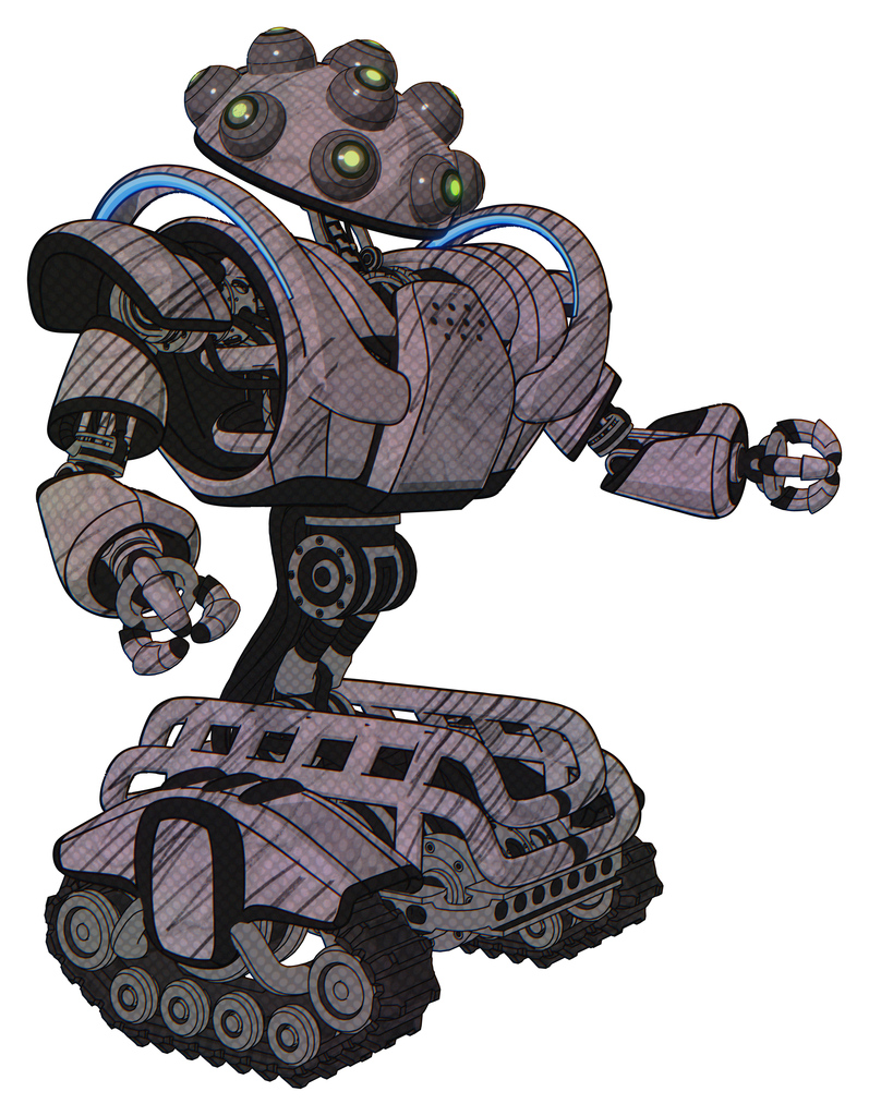 Automaton containing many robo-eye domehead design and heavy upper chest and heavy mech chest and battle mech chest and tank tracks. Dark sketch lines. Interacting.