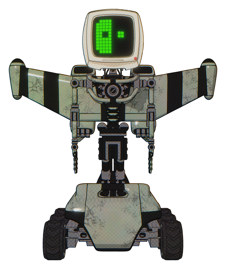 Droid containing old computer monitor and abstract mask pixel face and light chest exoshielding and stellar jet wing rocket pack and no chest plating and six-wheeler base. Green metal. Front view.